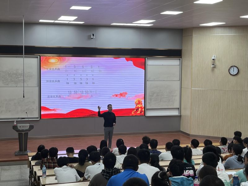 短短两个小时的讲座现场气氛热烈,通过音乐理论知识传授,基础演唱技巧讲解、我院梦溪合唱团演绎的歌曲《人世间-母亲节温情版》MV展示、主旋律音乐及歌曲鉴赏,让同学们充分感受音乐的魅力,接受爱国主义教育。人工智能221张雪茹同学表示:“通过讲座,我明白了音乐不仅是一种娱乐方式,更是听觉的艺术,时间的艺术,表现的艺术。当《义勇军进行曲》响起的那一刻,我从未有过昨晚听这首歌的那般震撼之感,有一股热流涌入我心。通过老师的讲解我也真正理解了这首歌所表达的意义。”智科222秦顺义同学说:“通过讲座,激发了我对音乐的热爱。“起来!不愿意做奴隶的人们!”是中国人保家卫国的决心,坚韧不屈,英勇奉献的精神。梦溪合唱团演绎的《人世间》MV,让我感触很深,学子们通过美妙的歌声表达对老师、对母亲的爱。我们都是一颗颗种子,在祖国母亲的呵护下成长,在庆祝中华人民共和国成立73周年之际,祝福伟大的祖国!”