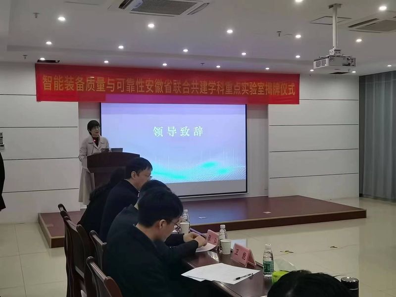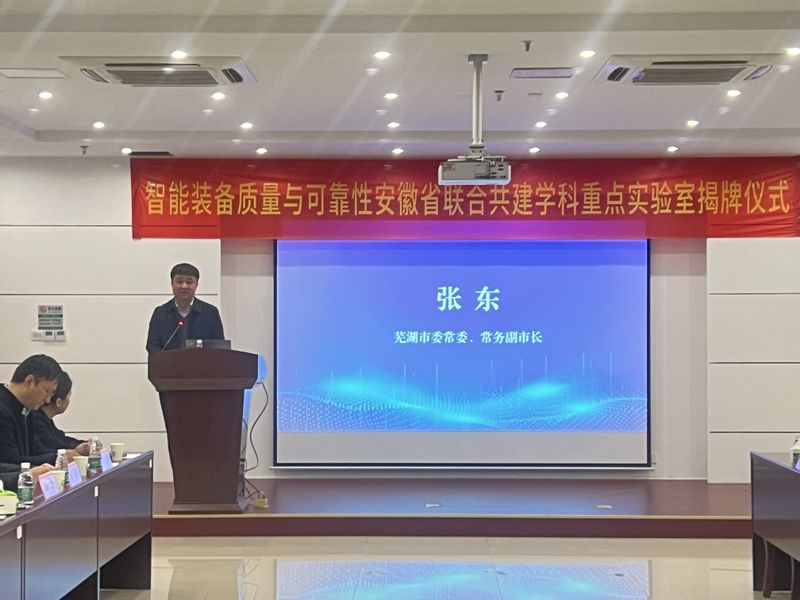 在揭牌仪式上,工业和信息化部电子第五研究所总工程师万举勇,校党委副书记苏国红,芜湖市委常委、常务副市长张东先后致辞。万举勇对芜湖赛宝公司的研究方向进行了介绍,并分别从科技创新、产业学科优势、服务社会等方面对芜湖赛宝公司的核心发展理念进行了阐述,并对接下来的“智能装备质量与可靠性”重点实验室建设及发展提出了殷切期望。