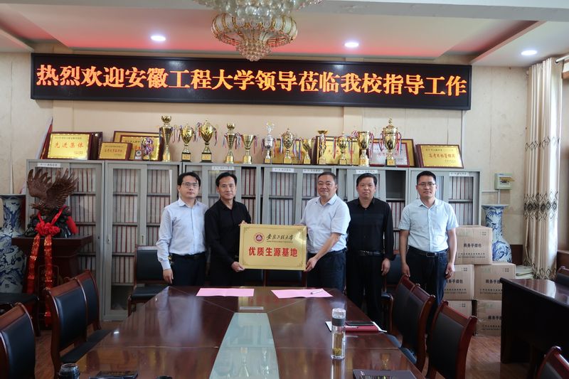 宣传组先后赴舒城县千人桥中学、舒城县第一中学签订安徽工程大学优质生源基地合作协议并进行授牌,前往舒城中学开展优质生源基地回访活动。每到一处,王弘、任家钱代表学校向中学领导、教导处负责人和高三年级组组长详细介绍了学校的办学历史、学科专业、考研就业、知名校友及学校舒城籍师生的发展和学习情况,重点介绍了学校近年来的新变化及学校“三全六专”育人实践和个性化人才培养的新理念与具体举措,并对各优质生源基地长期向我校输送大量的优秀毕业生表示感谢,希望通过优质生源基地拓展与回访加强校际联系与合作,吸引更多的优秀学子来我校深造。