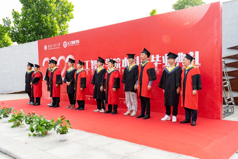 程双四、江本赤、刘玉飞和学院教授(校聘教授)为毕业生扶正流苏并合影留念。