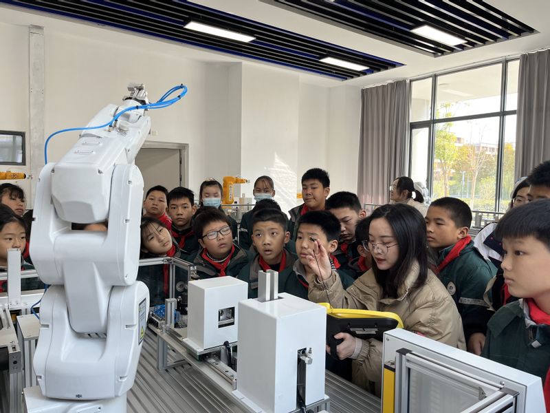 在机器人现代产业学院,同学们在大学生志愿者的带领下,参观了机器人协同作业实验室、机器人集成应用实验室、虚拟现实实验室。通过志愿者和专业老师的讲解,同学们了解了六自由度工业机器人的作业规划;如何通过编程操控机器人识别抓取、下料、码垛等作业任务。通过3D虚拟技术,更加直观的了解工业机器人的拆装和运动原理。在移动机器人导航实验室,同学们被各种类型、形态各异的智能车所吸引,看着智能车在设定的轨迹上来回穿梭、避障,大家异常兴奋。