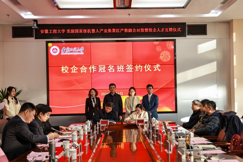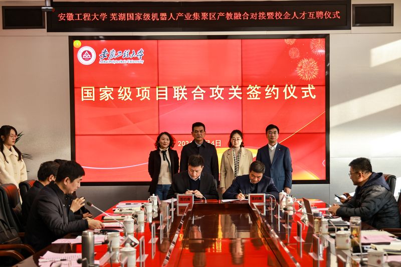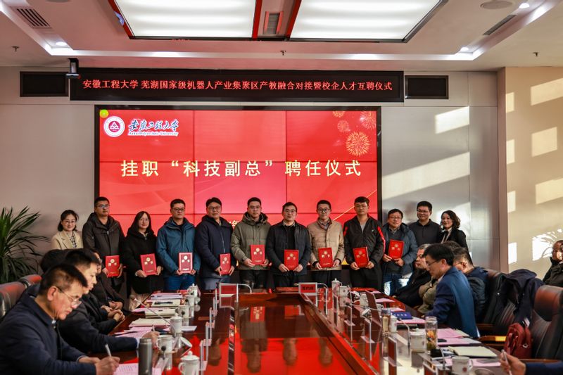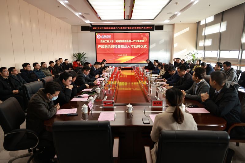1月4日下午,学校与芜湖国家级机器人产业集聚区产教融合对接暨校企人才互聘仪式在国际工程师学院图文信息中心701会议室举行。校党委副书记、校长卢平,鸠江区区委副书记梁燕,芜湖市科技局副局长沈燕、芜湖机器人产业发展集团有限公司董事长、总经理许礼进出席仪式。仪式由校党委常委、副校长凤权主持。