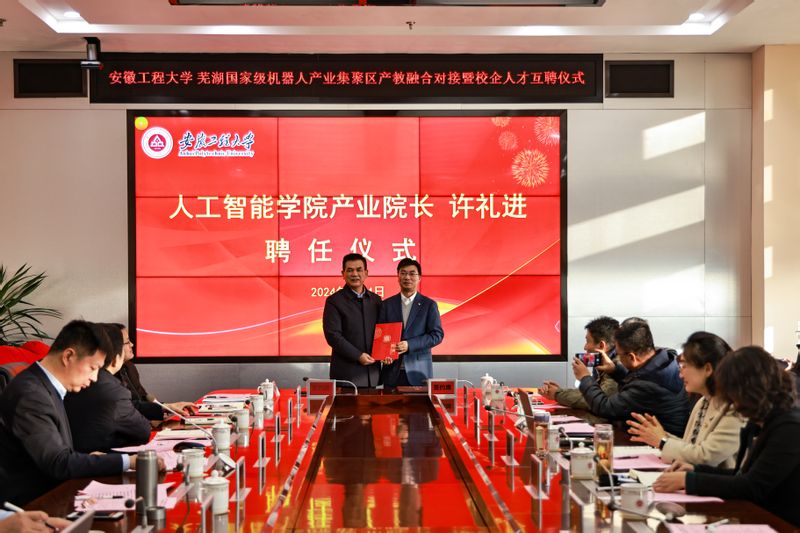 卢平对鸠江区和芜湖机器人产业园区长期以来给予学校的支持表示感谢,并为许礼进颁发了我院产业院长聘书。他指出,我院是新成立的学院,正处在发展的关键期和上升期,在专业学科建设方面亟需各方力量的支持与关注,许礼进在人工智能相关学科专业领域造诣深厚,具有丰富的学科专业建设和行政管理经验,聘任许礼进担任我院产业院长,对学院高质量发展将起到积极促进作用,希望许礼进能够尽快进入角色,了解我院的基本情况,助力我院又好又快发展。