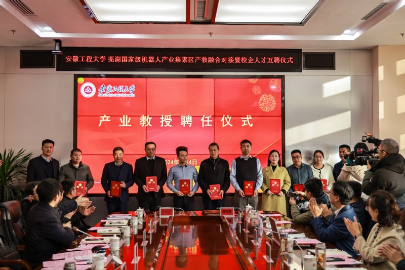 学校办公室、人事处、社会合作处、教务处、科技处、我院负责人,青年教师代表,鸠江区发改委负责人及芜湖国家级机器人产业集聚区24位企业负责人参加了仪式。